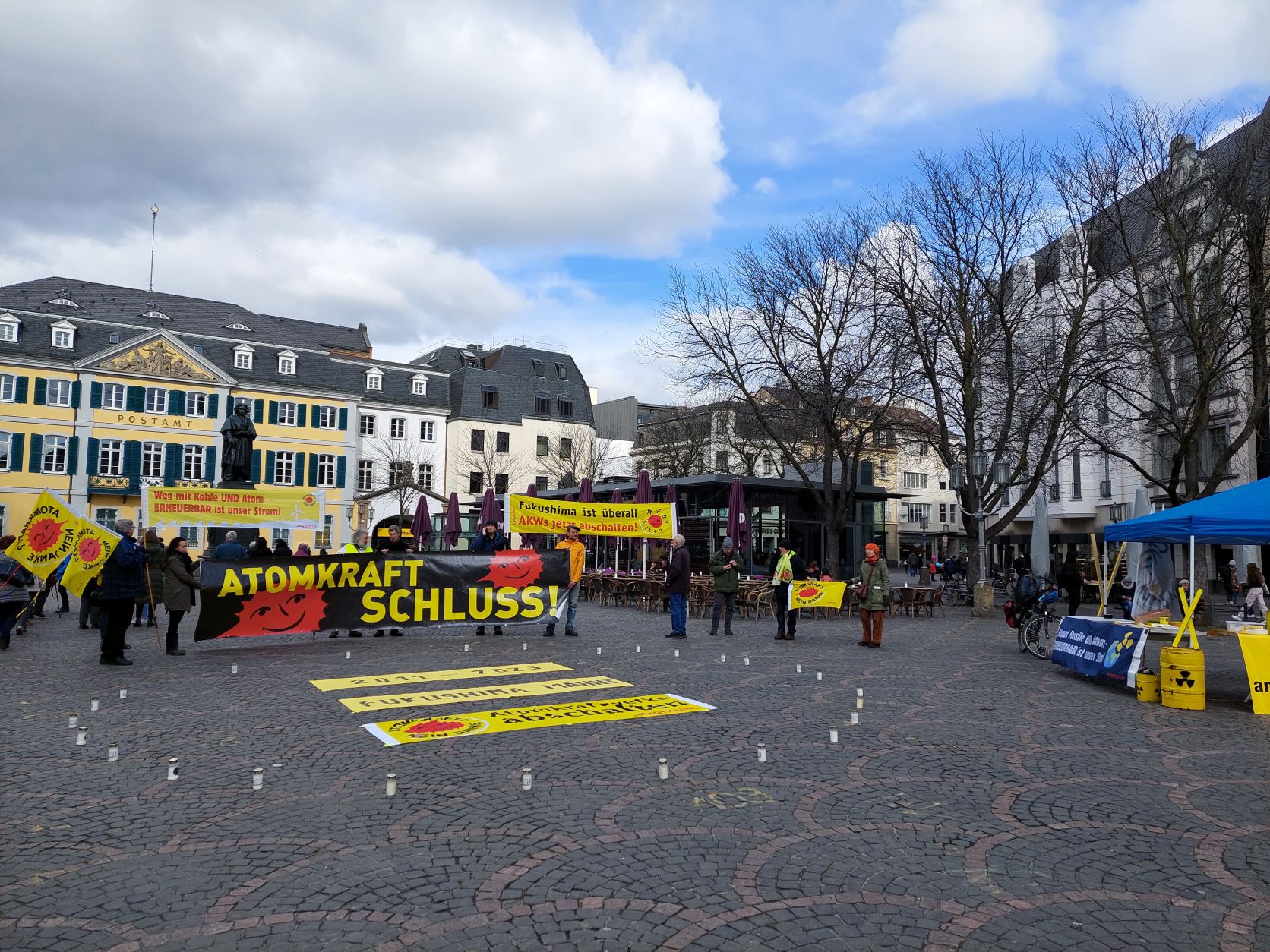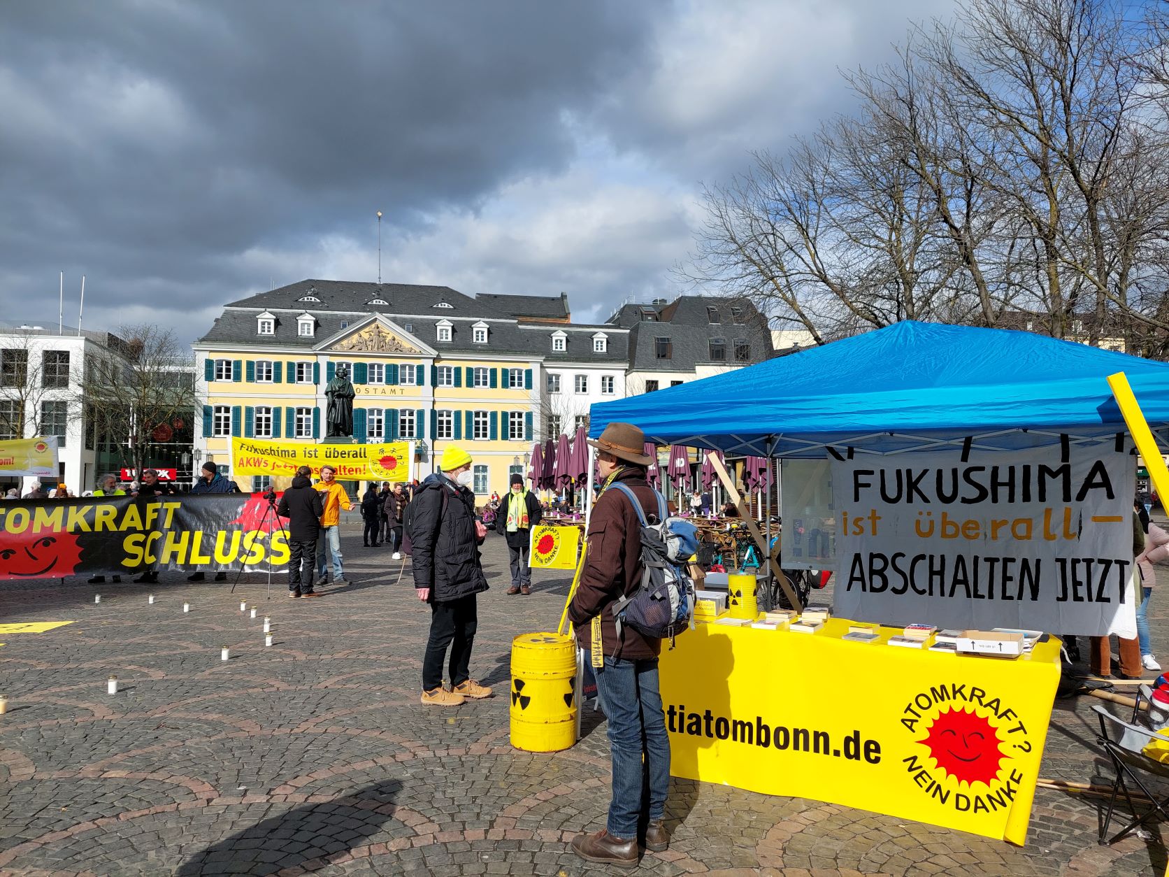 Die Sonne war auf unserer Seite! Am 12. Jahrestag der Reaktorkatastrophe von Fukushima haben wir auf dem Münsterplatz mit Mahnwache und Infostand auf die Gefahren der Atomkraft hingewiesen. Spätestens am 15. April müssen alle AKWs in Deutschland endgültig abgeschaltet werde!