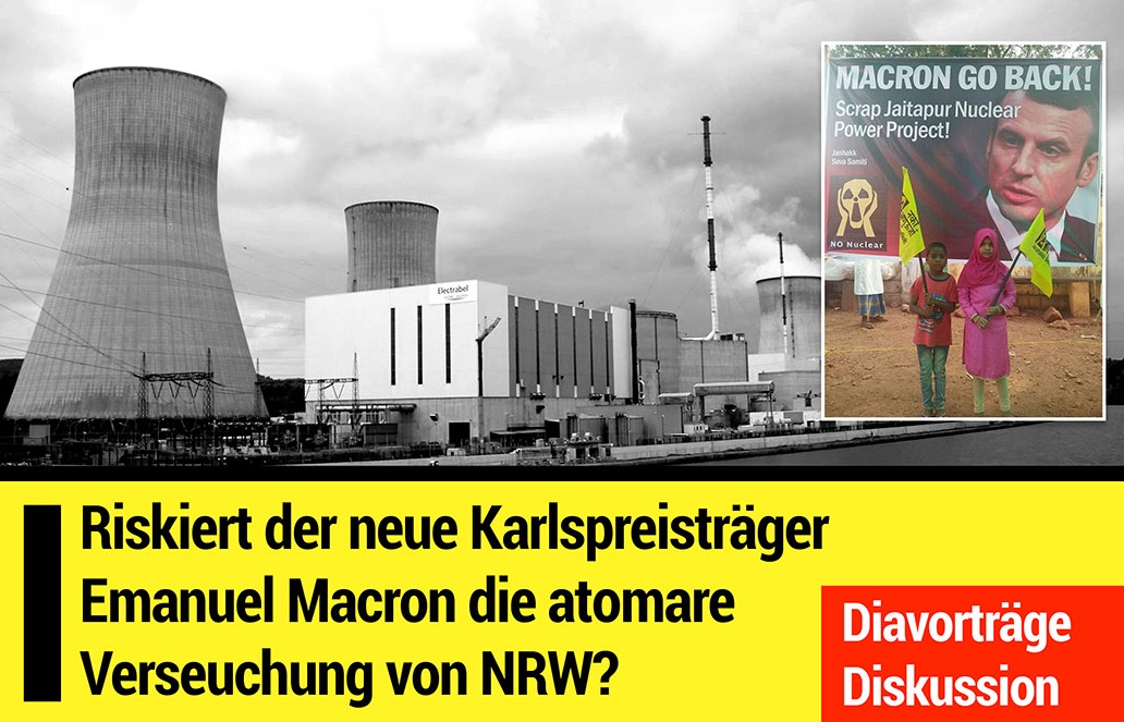 Emmanuel Macron, der am 10. Mai den renommierten Karlspreis erhält, gehört über den französischen Staat (rd. 24%) ein großter Teil der AKW Tihange und Doel. Mit dem Protest wird Macron aufgefordert, all seinen Einfluss geltend zu machen, damit die Reaktoren in Belgien geschlossen werden.