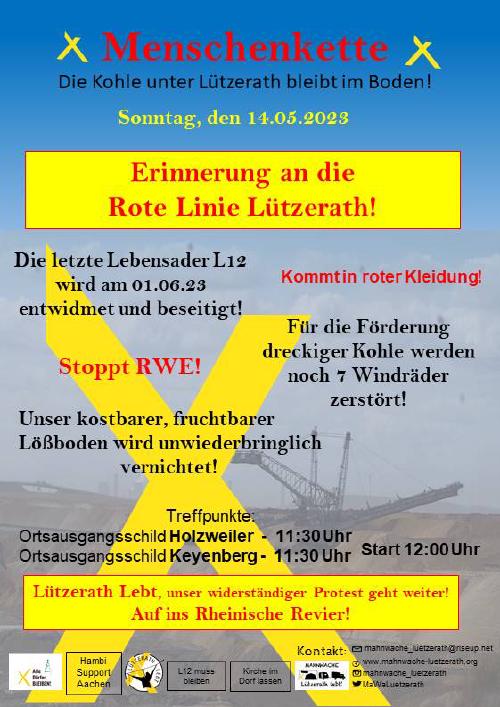 Deshalb lädt die Mahnwache Lützerath am Sonntag, 13. 8. ab 11:00 Uhr zum Brunch auf der L12 ein: "Lasst uns die L12 gemeinsam zur Spielstraße machen - bis der Bagger vor der Straße stoppt. Wir möchten am Sonntag 13.8 ab 11:00 Uhr auf der L12 zwischen #Keyenberg und Abzweig Oberwestrich gegen den Abriss mit einem vielfältigen, bunten Programm zeigen, dass die Straße und die Windräder bleiben müssen. Bringt was für den Brunch, verschiedene Sportspiele (Sackhüpfen, Gummitwist, Fußball, Seilchen...), Musik, Straßenkreide, witzige Fahrzeuge, Jonglage.....mit und lasst uns damit unsere neuen Bushaltestellen entstehen. Jede Idee ist willkommen...wir sind gespannt."