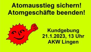 Deshalb rufen wir für diesen Samstag, 21. Januar, 13 Uhr, zur Kundgebung vor dem RWE-AKW in Lingen auf. Dabei wollen wir auch Solidarität mit den Klima-Initiativen rund um Lützerath zeigen – dort werden die vertraglich fixierten deutschen Selbstverpflichtungen für das Pariser Klimaschutzabkommen einfach weggebaggert!